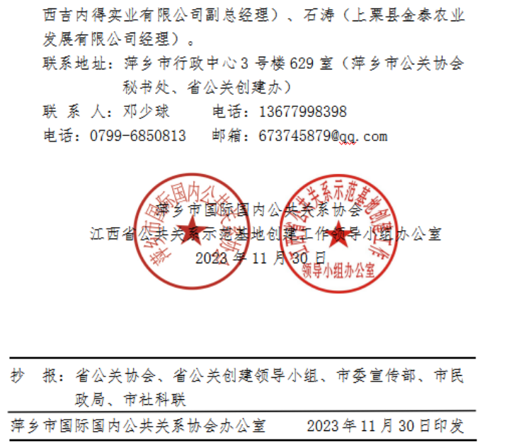 杨 颖 省公关协会副会长、江西师范大学中华传统文化教育发展中心主任(原公费师范生院常务副院长)敖云萍 省公关协会副会长、萍乡市公关协会常务副会长兼秘书长袁永红 省公关协会副会长、宜春市公关协会副会长兼秘书长